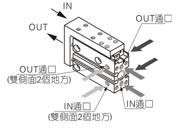 2、氣缸可從3個(gè)方向配管,默認(rèn)出廠為后端面進(jìn)出氣,側(cè)面兩組進(jìn)出氣口已用堵頭密封,也可根據(jù)實(shí)際需要重新開(kāi)啟側(cè)面其它兩組進(jìn)出氣口;