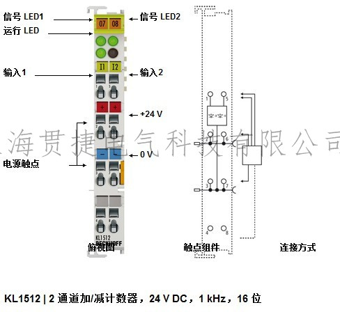 加/減計數(shù)器用于計算二進(jìn)制脈沖,并以電氣隔離的方式將計數(shù)器狀態(tài)傳到上 層自動化設(shè)備中。也可以選擇將 KL1512 總線端子模塊設(shè)置為加/減計數(shù)器(16 位)。每個總線端子模塊含有 2 個通道,每個通道都有 個 LED 用來指示其信號狀態(tài)。KL1512 特別適用于簡單的計算任務(wù),例如連接流量計。