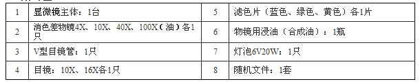 1 | 顯微鏡主體:1臺 | 5 | 濾色片(藍色、綠色、黃色)各1片 |