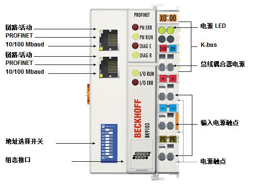 BK9103 總線耦合器用于將模塊化、可擴(kuò)展的電子端子排連接到 PROFINET IO 系統(tǒng)。 個(gè)節(jié)點(diǎn)由 個(gè)總線耦合器、1- 64 個(gè)任意數(shù)量的端子模塊(通過 K-bus 擴(kuò)展可達(dá) 255 個(gè))以及 個(gè)末端端子模塊組成。